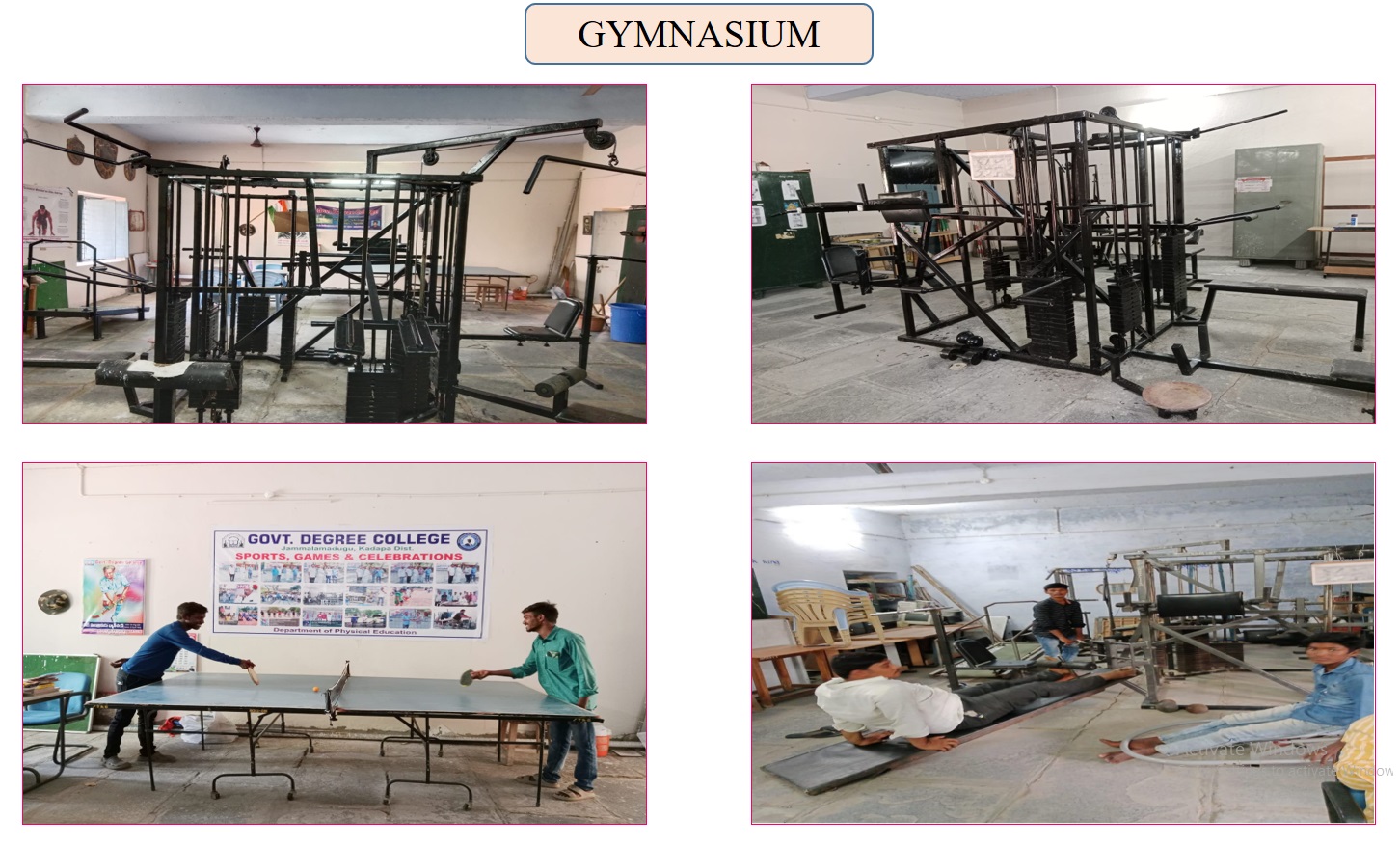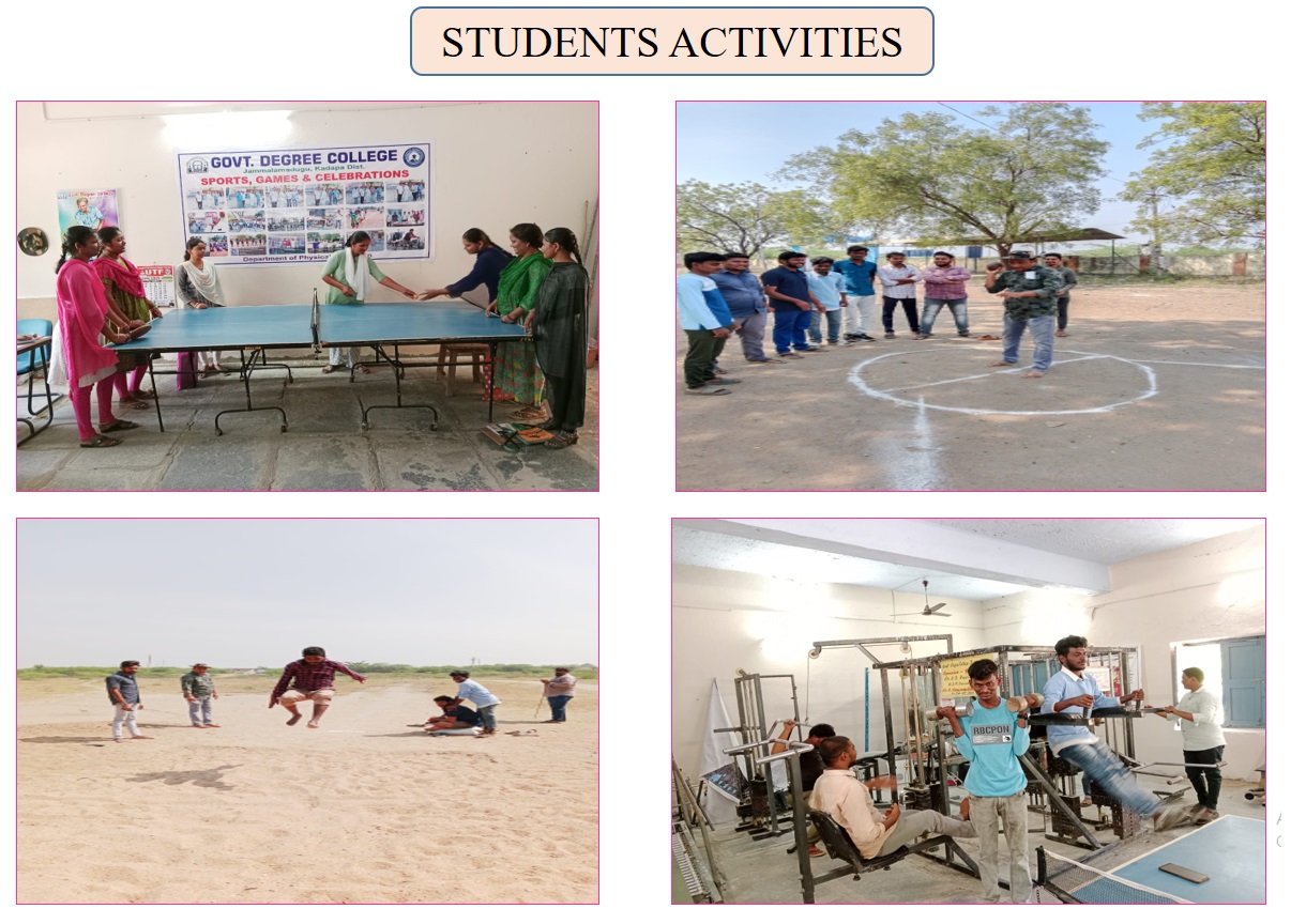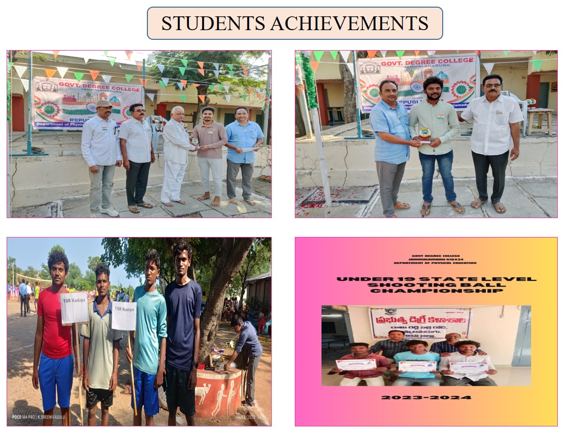 The Physical Education department Government Degree College, Jammalamadugu to be established in 1980 physical educations has been striving for games and sports excellence and at the same time sponsoring varieties of activities that would contribute to the whole some development of personality and promote health among students. Sports and games are one such area promoted by the physical education department with an intention of ensuring physical, mental and emotional health of the student community. VisionTo engage in relentless pursuit of excellence in the promotion and development of Physical Education and sports through innovative programme in coaching and training students and evolve a holistic approach to the betterment of human resources through a harmonious blend of body, mind and spirit MissionActively design programme for the promotion and the development of fitness, health and mind among the sports person so as to mould them into physically fit & emotionally matured citizens with leadership quality. To closely collaborate and coordinate with the State and National Sports Bodies in matters of common interest. ObjectivesThe Department of Physical Education aims at preparing highly competent and skilled players in sports and moulding them as professional players.
